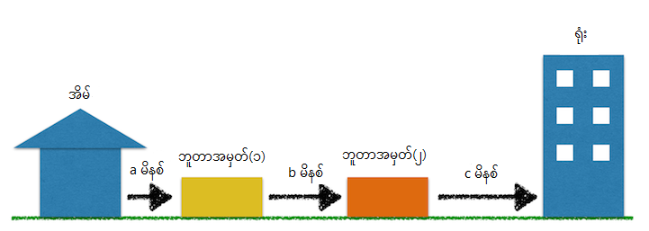 အလုပ်မှ ရုံးသို့သွားရန် နောက်အကျဆုံးအိမ်မှမည့်သည့်အချိန်ထွက်ရမည်ကို ဆုံးဖြတ်သောProgramကိုရေးပါ။ ၁) အိမ်မှ ဘူတာအမှတ်(၁) သို့သွားရန် a မိနစ်ကြာသည်။ ၂) ဘူတာအမှတ်(၁)မှဘူတာအမှတ်(၂)သို့သွားရန် b မိနစ်ကြာသည်။ ၃)ဘူတာအမှတ်(၂)မှ ရုံးသို့သွားရန် c မိနစ်ကြာသည်။ သင်သည်ရုံးသို့ 8:59 မတိုင်ခင် ရောက်ဖို့လိုအပ်သည်။ ဥပမာ Input တန်ဖိုးသည် 30 30 10 3 6 0 7 0 8 0 ဖြစ်ခဲ့လျှင် ဘူတာအမှတ်(၁)မှ ရထားသည် 6:00, 7:00, 8:00 တွင် ရထားလာမည်ဖြစ်သည်။ 7:30 တွင် အိမ်မှထွက်ပြီး 8:00ရထားကိုစီးလျှင် ရုံးသို့ 8:40 ရောက်မည်။ ထိုကြောင့် output(အိမ်မှထွက်ရမည့်အချိန် )သည် 7:30 ဖြစ်သည်။ ပထမ Input 30 30 10 ဆိုသည်မှာအိမ်မှ ဘူတာအမှတ်(၁) သို့သွားရန်ကြာချိန်၊ ဘူတာအမှတ်(၁)မှဘူတာအမှတ်(၂)သို့သွားရန်ကြာချိန်၊ ဘူတာအမှတ်(၂)မှ ရုံးသို့ သွားရန်ကြာချိန်ဖြစ်သည်။ ဒုတိယ Input 3 သည် ရထားလာမည် အကြိမ်အရေအတွက်ဖြစ်သည်။ ဥပမာ Input တန်ဖိုးသည် 10 10 10 6 8 5 8 15 8 25 8 35 8 45 8 55 ဖြစ်ခဲ့လျှင် Outputမှာ 08:25 ဖြစ်သည်။