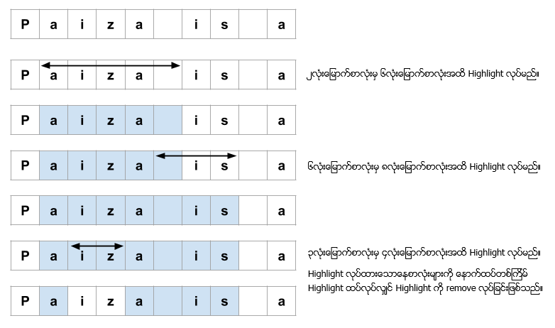စာလုံးများကို Highlight pen ဖြင့် Highlight လုပ်ပြီး စာလုံးဘယ်နှစ်လုံး Highlight လုပ်ခဲ့သည်အရေအတွက်ကို outputထုတ်ပေးပါ။ Highlight လုပ်ထားသော စာလုံးများကို နောက်ထပ်တစ်ကြိမ် Highlight ထက်လုပ်လျှင် Highlight ကို remove လုပ်ခြင်းဖြစ်သည်။ Input လက်ခံမည် Format မှာအောက်ပါအတိုင်းဖြစ်သည်။ L N a_1 b_1 a_2 b_2 ... a_N b_N L သည် စာလုံးအရေအတွက်ဖြစ်ပြီး၊ N သည် Highlight လုပ်ရမည့်အကြိမ်ရေအတွက်ဖြစ်သည်။ a_N သည် Highlightလုပ်ရမည့် start positon ဖြစ်ပြီး၊ b_N သည် Highlightလုပ်ရမည့် end positon ဖြစ်သည်။ ဥပမာ (၁) Input တန်ဖိုးသည် 10 3 2 6 6 8 3 4 ဖြစ်ခဲ့လျှင် Outputမှာ 5 ဖြစ်သည်။ ဥပမာ (၂) Input တန်ဖိုးသည် 10 10 1 6 2 5 1 7 1 7 2 7 2 8 1 4 2 2 1 10 2 10 ဖြစ်ခဲ့လျှင် Outputမှာ 1 ဖြစ်သည်။ ဥပမာ (၃) Input တန်ဖိုးသည် 100 5 1 100 1 100 1 100 1 100 1 100 ဖြစ်ခဲ့လျှင် Outputမှာ 100 ဖြစ်သည်။ ဥပမာ (၄) Input တန်ဖိုးသည် 100 20 14 14 53 100 60 64 78 82 43 45 6 7 44 45 83 98 55 58 34 34 21 37 17 73 90 98 55 62 69 76 25 73 11 89 92 94 49 53 17 17 ဖြစ်ခဲ့လျှင် Outputမှာ 83 ဖြစ်သည်။